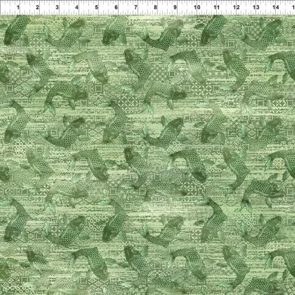 “Supplier Super Sale Special – limited quantities available once cut from the bolt.” Graceful koi fish drift across layered oriental textures in deep green tones, creating a richly detailed and fluid feature print. Perfect for statement quilts, bold designs and projects that bring movement and natural elegance.