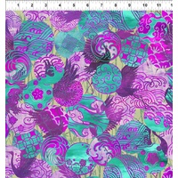 “Supplier Super Sale Special – limited quantities available once cut from the bolt.” Ornate oriental emblems repeat across deep purple tones, creating a richly patterned design with structure and visual depth. Perfect for adding contrast, interest and a refined traditional touch to quilts and sewing projects.