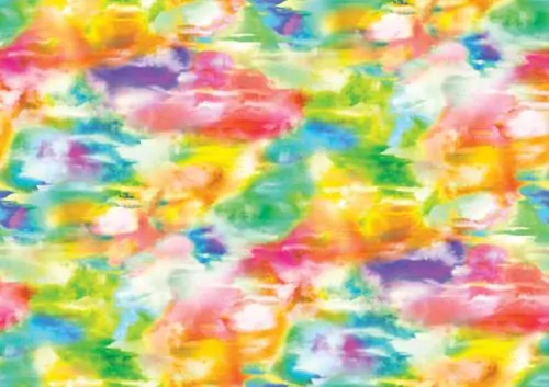 “Supplier Super Sale Special – limited quantities available once cut from the bolt.” Sweeping watercolour-style brushstrokes blend across the fabric in a lively rainbow palette of sunshine yellow, coral, turquoise, lime, violet and soft pink. The colours flow and merge like painted washes on canvas, creating a dreamy abstract effect full of movement and light. This expressive design brings an artistic feel to quilts, bags and creative sewing projects, adding a burst of colour and painterly texture wherever it is used.