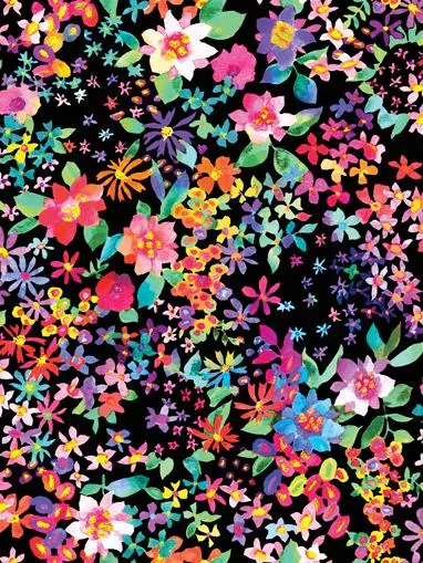 “Supplier Super Sale Special – limited quantities available once cut from the bolt.” A striking scatter of vibrant watercolour-style florals bursts across a deep midnight black background, creating dramatic contrast and luminous colour. Painterly blossoms in shades of coral, turquoise, violet, lemon, pink and teal dance across the fabric alongside delicate leafy sprigs and tiny blooms, giving the design movement and depth. This bold floral print captures the joyful spirit of a glowing night garden and makes a stunning feature fabric for quilts, bags, borders and statement sewing projects.
