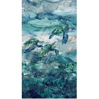 “Supplier Super Sale Special – limited quantities available once cut from the bolt.”  From the Sea Breeze collection by Northcott, this stunning 24" panel features graceful sea turtles swimming through layered ocean waters in beautiful shades of blue, teal and aqua. Designed as a wide border panel, it is perfect for feature quilt borders, wall hangings, bags or coastal themed sewing projects.