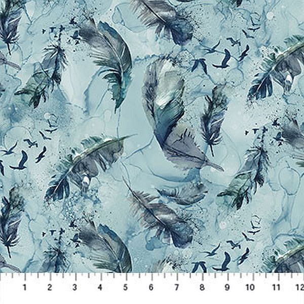 “Supplier Super Sale Special – limited quantities available once cut from the bolt.” From the Soar collection by Northcott, this atmospheric design features drifting feathers and flying birds in layered shades of moody blue across a darker tonal background. The painterly watercolour effect creates movement and depth, making it a beautiful choice for quilts, borders, quilt backs and nature-inspired sewing projects.