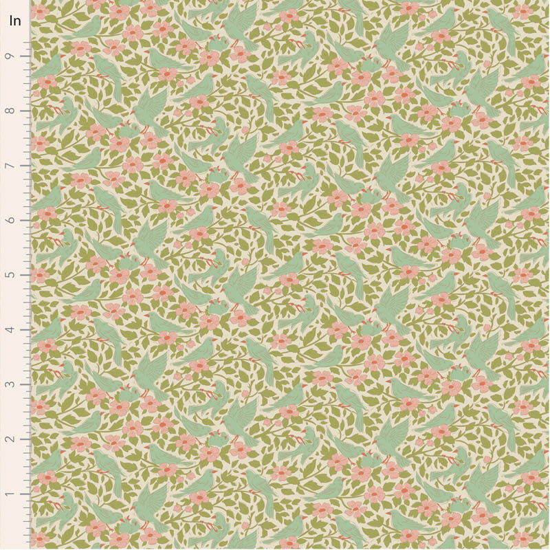 Songbird by Tilda designer Tone Finanger. Ava Green features graceful birds among flowing florals in a gentle green palette with blush and neutral accents. Calm and versatile, this colourway is perfect for timeless sewing projects. Ideal for quilts, bags, garments and coordinated makes.