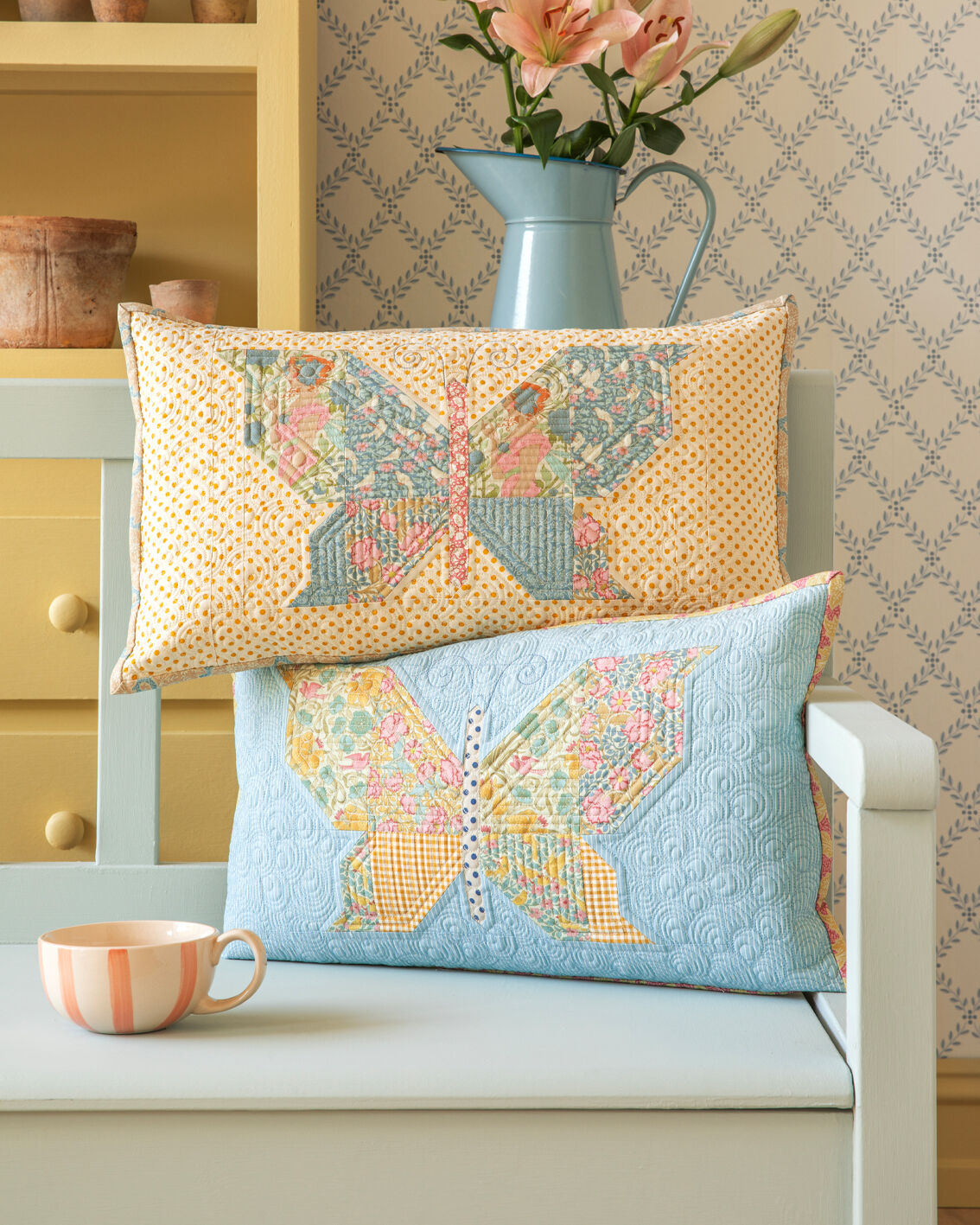 Songbird by Tilda designer Tone Finanger. The Mosaic Butterfly Pillow Kit MUSTARD is a beautifully curated sewing kit designed to create a feature cushion with eye-catching colour and pattern. Inspired by mosaic-style detailing and butterfly motifs, this kit brings together carefully selected fabrics that create visual impact while remaining elegant and balanced.