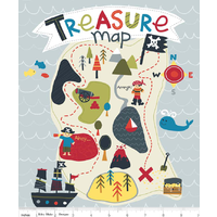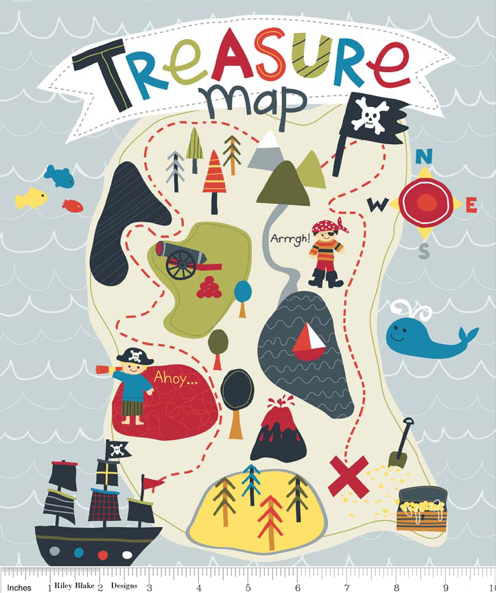 Treasure Island novelty quilt fabric panel by Riley Blake features pirates, ships, islands, skulls and cross bones on grey