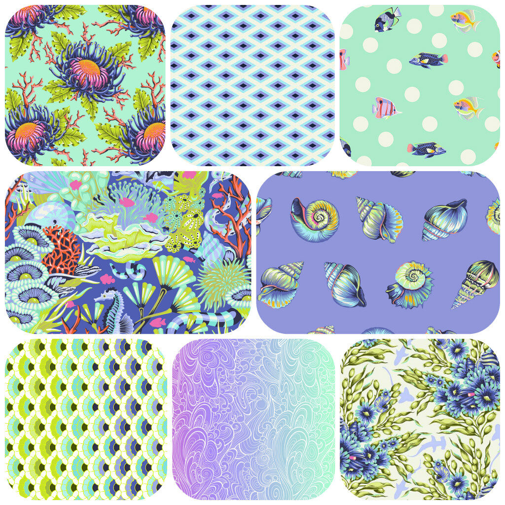 Scrappy reef florals and sea life in perfectly sized squ