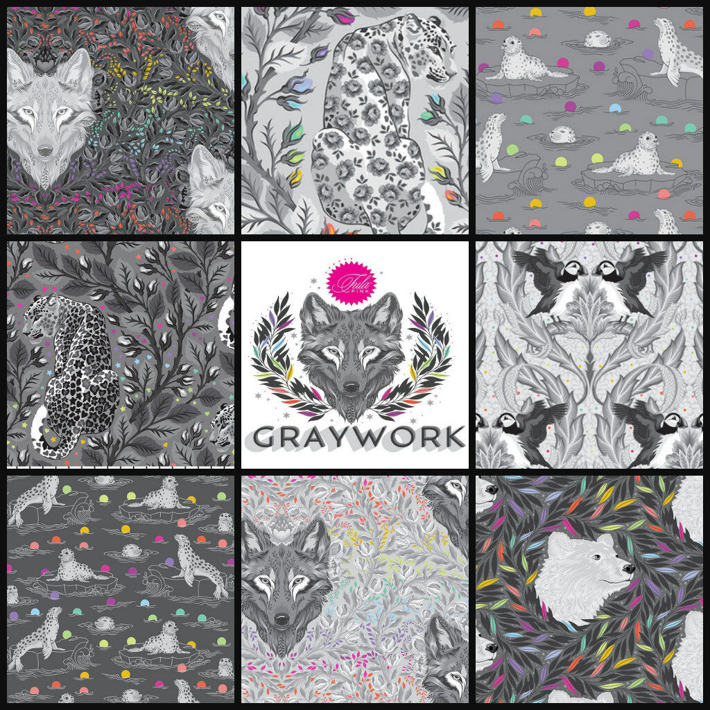 Tula Pink’s Graywork is the stunning follow-up to her beloved Linework, this time shifting into a spectrum of grays with the occasional pop of colour. Hero animal prints (wolves, seals, puffins, leopards and more) meet versatile textures, dots and stripes, creating a collection that is both bold and neutral. Perfect for modern quilts, bags, apparel and home décor.
