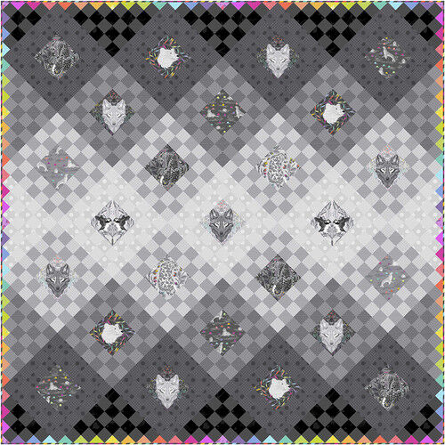 The Fade to Gray Quilt Kit (KIT2QTTP.FADE) showcases Tula Pink’s dramatic Graywork collection paired with True Colors coordinates. This striking grayscale quilt combines wolves, leopards, puffins, seals, and bears with versatile dots, stripes, and textures.