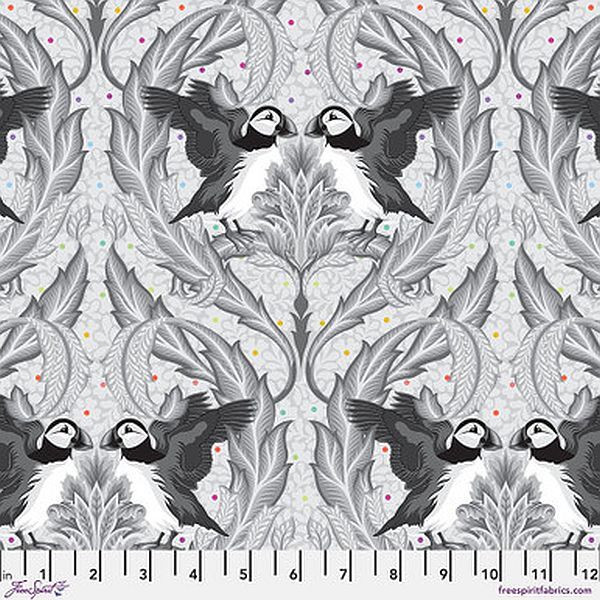 Graywork by Tula Pink. Huffin & Puffin in Whisper is a delightful animal print featuring puffins with playful personality. In light whisper gray, this design brings novelty charm to the Graywork range. Premium FreeSpirit quilting cotton.