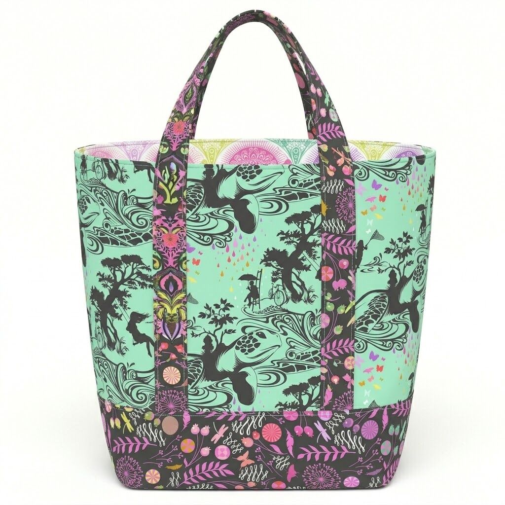 Create a bold and practical tote with this Grocery Library Bag Kit featuring fabrics from Prince Charming Déjà Vu by Tula Pink for FreeSpirit Fabrics. This eye-catching kit is perfect for makers who love statement prints, playful colour, and a roomy everyday bag ideal for shopping, library books, sewing supplies, and more.