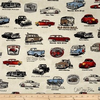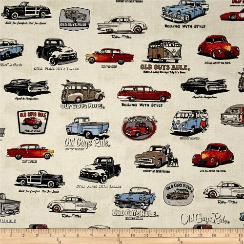 Old guys rule fabric by Robert Kaufman with vintage cars including Woodys, Falcons, Dodge, Hot Rods, VW Combi Vans and more on a cream background